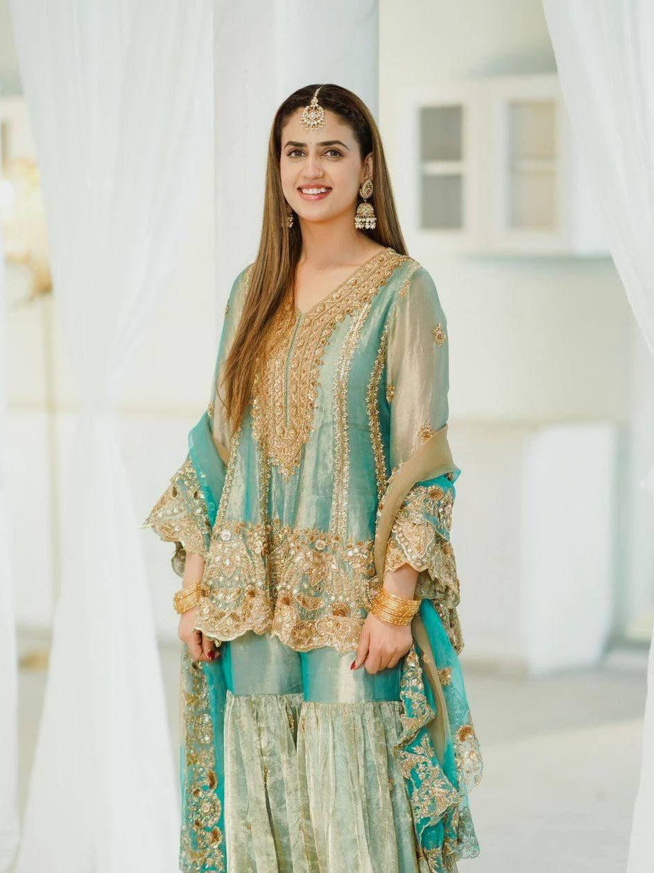 PREMIUM DESIGNER FENDY CRUSH TOP-SHARARA-DUPATTA SET WITH ZARI SEQUINS WORK