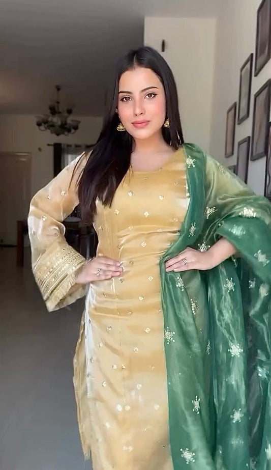 GOLDEN & GREEN DESIGNER SILK BELL SLEEVES KURTA , PANT WITH DUPATTA