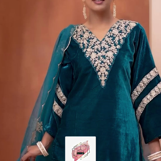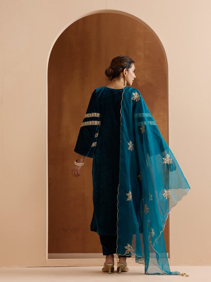 Elevate your festive look with this rich teal velvet straight kurta set, adorned with intricate embroidery for a luxurious touch. Paired with a straight bottom and a sheer organza dupatta featuring delicate embroidery and an elegant scalloped border, this ensemble is perfect for grand occasions and celebratory events.